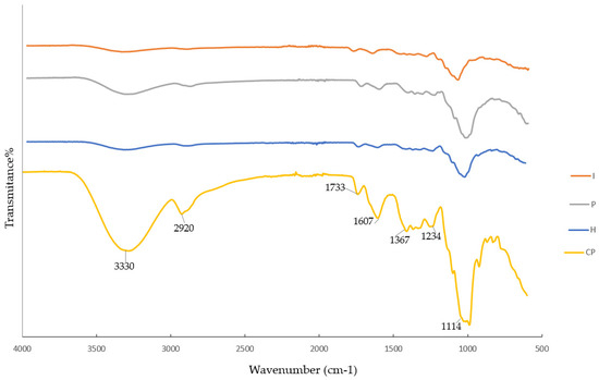 Fourier transform infrared spectroscopy of carrot pomace (CP) and its derivatives after hemicellulase (H), pectinase (P), and invertase (I) pretreatments.