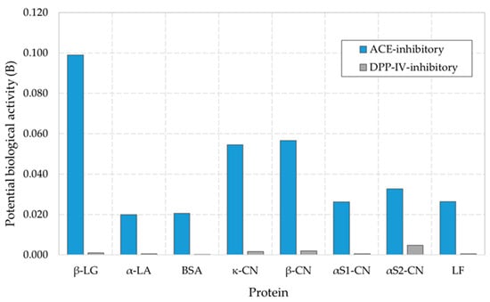 - Potential biological activity of protein fragments (B)B = [Σ(ai/IC50i)]/N,ai—the number of repeats of the i-th bioactive fragment in the protein sequence; IC50i—the concentration of the i-th bioactive peptide corresponding to half-maximum inhibition [μM]; N—the number of amino acid residues.