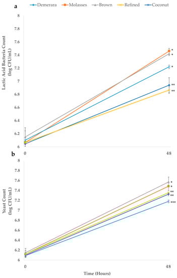 The growth of lactic/acetic acid bacteria (a) and yeasts (b) during the fermentation process of water kefir grains in different fermentative sugary substrates sugary substrates (Demerara, Molasses, Brown, Refined and Coconut). The asterisks indicate groups without a statistical difference (*, **, or ***), according to the Tukey test performed for the results at 48 h.