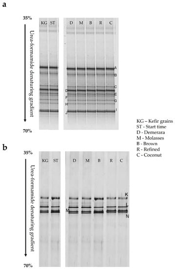 Profiles of microbial communities from water kefir grains and beverages. (a) Prokaryotic group (Band A: Lacticaseibacillus paracasei (Access number—AB368902.1), Band B: L. kefiri (Access number—AB3626680.1), Band C: L. parabuchneri (Access number—AB368914.1), Band D: L. casei (Access number—EU626005.1), Band E: L. paracasei subsp. paracasei (Access number—NR025880.1), Band F: L. paracasei subsp. tolerans (Access number—AB181950.1), Band G: L. buchneri (Access number—FJ867641.1), Band H: Lactococcus lactis (Access number—EU194346.1), Band I: Leuconostoc citreum (Access number—FJ378896.1), and Band J: Acetobacter lovaniensis (Access number—AB308060.1)). (b) Eukaryotic group (Band K: Kluyveromyces lactis (Access number—AJ229069.1), Band L: Saccharomyces cerevisiae (Access number—EU649673.1), Band M: Kazachstania aerobia (Access number—AY582126.1), and Band N: Lachancea meyersii (Access number—AY645661.1)).