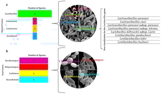Diversity of the microbial genera present in water kefir grains and beverages. (a) Bacteria genera; (b) Yeast genera.