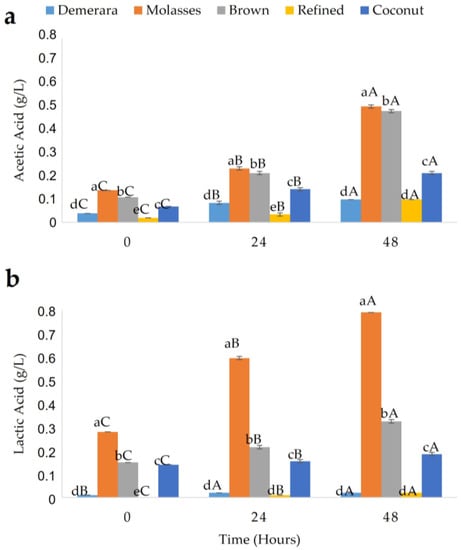 Behavior of acetic (a) and lactic (b) acids during the fermentation process of water kefir grains in different fermentation sugary substrates (Demerara, Molasses, Brown, Refined and Coconut). The same lower-case letters at the same fermentation time indicate that there is no statistical difference for the different samples. Equal capital letters at different fermentation times indicate that there is no statistical difference for the same sample, according to the Tukey test.