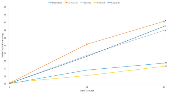 Biomass growth of water kefir grains during the fermentation process in different sugary substrates (Demerara, Molasses, Brown, Refined and Coconut). The asterisks indicate groups without a statistical difference (* or **) according to the Tukey test performed for the results at 48 h.