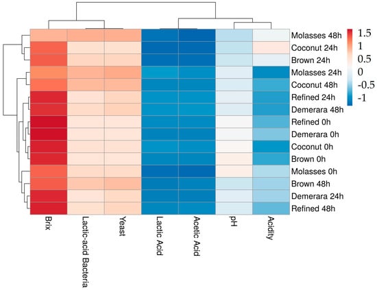 The clustering of the multivariate statistical analysis in the form of a heatmap is presented in Figure 7. The analysis was performed considering the physicochemical and microbiological parameters of the fermented water kefir beverages according to the type of sugar used and the fermentation time. Two larger clusters resulted from the analyses. The first cluster, on the left, is subdivided into Brix, lactic-acid bacteria, and yeast.