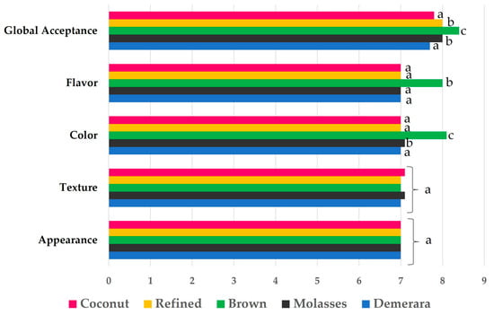 The kefir beverages (demerara, molasses, brown, refined, coconut) were evaluated in a sensory test by 100 untrained testers, both males and females, 25–55 years of age (students and staff of the Federal University of Bahia, Brazil). The tasters were asked to indicate how much they liked or disliked each product on a 9-point hedonic scale (9 = like extremely; 1 = dislike extremely) according to overall acceptability. Evaluations of the appearance, color, flavor, and texture attributes were conducted.