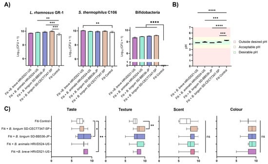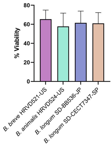 3.1. Viability of Lyophilized Probiotic Bifidobacteria