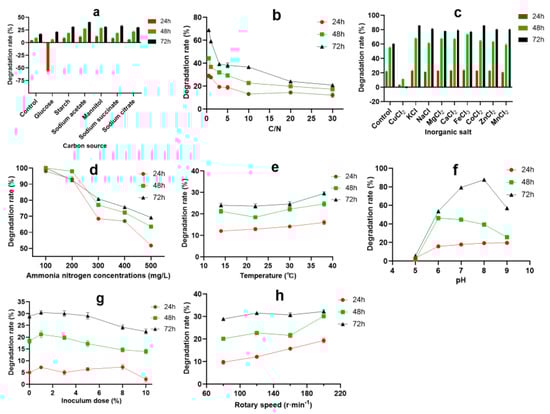 | No. | Carbon Source | C/N | Rotary Speed/r·min−1 | Inoculum Dose/% | pH | Degradation Rate/% |