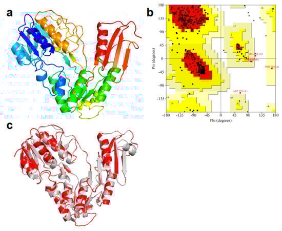- Laskowski, R.A.; MacArthur, M.W.; Moss, D.S.; Thornton, J.M. PROCHECK: A Program to Check the Stereochemical Quality of Protein Structures. J. Appl. Crystallogr. 1993, 26, 283–291. [Google Scholar] [CrossRef]