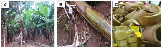 23.800943° S 30.123264° E 799 m M1 R71 Tzaneen 0850), Limpopo province, South Africa. The BPS was washed to remove soil and other debris using tap water. The washed BPS was cut into small pieces (approximately 20–25 cm in diameter and 10 cm in height) and the outer and core bark (pith) were separated into several blocks (Figure 1).2.3. Pre-Treatment of Banana Pseudostem