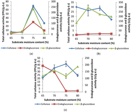 3.4. Effect of Initial Substrate Moisture Content on the Production of the Cellulase Enzyme System