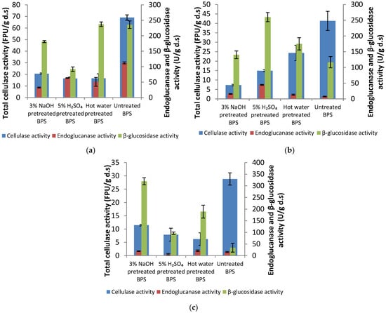 - Salomāo, G.S.B.; Agnezi, J.C.; Paulino, L.B.; Hencker, L.B.; de Lira, T.S.; Tardioli, P.W.; Pinotti, L.M. Production of cellulases by solid state fermentation using natural and pre-treated sugarcane bagasse with different fungi. Biocatal. Agric. Biotechnol. 2019, 17, 1–6. [Google Scholar] [CrossRef]
