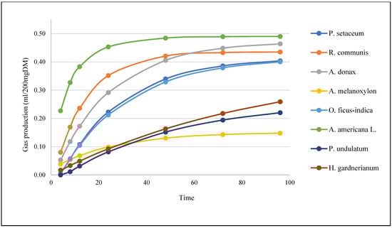 Agave americana L. produced the highest amount of gas from the start of incubation to the end (22.68 to 48.99 mL/200 mgDM), contrasting with