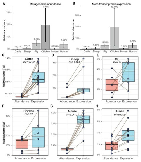 A comparison between the levels of meta-transcriptomic expression and metagenomic abundance was conducted for each individual. It was found that the meta-transcriptomic expression in rumen/gut of cattle (p = 7.3 × 10−6, Figure 1C), sheep (p = 0.0023, Figure 1D), mouse (p = 2.0 × 10−5, Figure 1G), and human (p = 0.0012, Figure 1H) were significantly higher than that of metagenomic abundance. This indicates greater functional activity. The meta-transcriptomic expression in pigs (p = 0.24, Figure 1E) and chickens (p = 0.12, Figure 1F) were higher, although not significantly, than metagenomic abundance.
