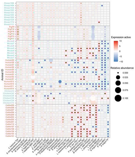 Expression profile of probiotic strains in the gut/rumen of cattle, sheep, pigs, chickens, mice, and humans. The x-axis and y-axis represent probiotic strain and sample name, respectively. Circle size represents the metagenomic abundance of probiotic strain in the sample. Color scale represents the log2 transformed “expression activity”, which is defined as “meta-transcriptomic expression/metagenomic abundance”.