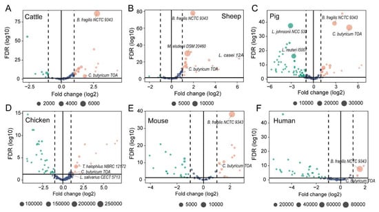 There were 17 (cattle, Figure 3A), 21 (sheep, Figure 3B), 22 (pig, Figure 3C), 14 (chicken, Figure 3D), 13 (mouse, Figure 3E), and 3 (human, Figure 3F) probiotic strains that were identified as overexpressed probiotic strains. Of them, Lactobacillus salivarius CECT 5713 is a probiotic strain that is commonly found in the gut of chickens and other animals. It was found to be the most abundant probiotic strain in this study. In addition, the strain of C. butyricum TOA was the another commonly overexpressed probiotic strains, which was found that significantly high expressed in all host species. It should be noted that there were 9 (cattle), 4 (sheep), 54 (pig), 32 (chicken), 23 (mouse), 31 (human) probiotic strains that demonstrated significantly suppressed expression (Table S2).
