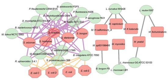 To explore the relationship between probiotics and pathogens, we generated a negative network plot based on gene expression (meta-transcriptomic data) of probiotics and pathogens to identify potential probiotics that may inhibit pathogenic bacteria (Figure 4). Our results showed that probiotic strains belonging to the genus Lactobacillus (L. curvatus WiKim38, L. reuteri I5007, L. rhamnosus GG ATCC 53103, L. mucosae LM1) were the only species negatively associated with Mycoplasma. Several species of Mycoplasma are pathogenic in humans and animals, such as Mycoplasma californicum. García-Galán’s study reported that the addition of Lactobacillus spp. could negatively affect the viability of Mycoplasma []. Here, we identified four candidates of Lactobacillus spp. that may have adverse effects on Mycoplasma. In addition, our results showed that four probiotic strains, including Rhodobacter sphaeroides 2.4.1, Phaeobacter inhibens DSM 17395, Megasphaera elsdenii DSM 20460, and Bacillus coagulans ATCC 7050, were negatively associated with both Salmonella spp. and Escherichia coli. Additionally, nine probiotic strains were negatively linked with Salmonella spp. only. Among them, the four probiotics associated with antimicrobial efficacy in aquaculture as mentioned above (Phaeobacter inhibens DSM 17395, Micrococcus luteus NCTC 2665, and Pseudomonas fluorescens A506) were showed to be negatively associated with either or both Salmonella spp. and E. coli, suggesting that these antimicrobial probiotics may also have an antibacterial effect in humans or livestock.