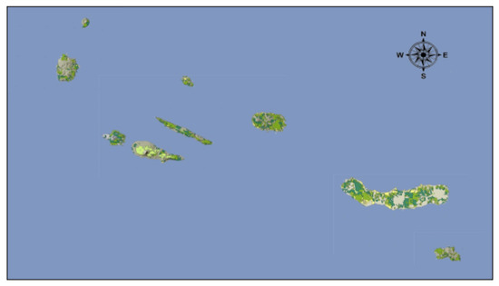 This study was carried out in the Azorean archipelago (Figure 1). The Azores archipelago is constituted by nine islands divided into three groups: the Western Group (Flores, Corvo), the Central Group (Terceira, Faial, Pico, São Jorge, Graciosa), and the Eastern Group (São Miguel, Santa Maria). The area occupied by the islands and islets that together make up the archipelago is equivalent to about 2.5% of Portuguese territory (2322 Km2). The islands themselves are of unequal size; the three largest, São Miguel (745.8 Km2), Pico (448.4 Km2), and Terceira (403.4 Km2), represent 70% of the total area of the archipelago; São Jorge (245.9 Km2), Faial (173.8 Km2), and Flores (141.6 Km2) are of intermediate size; and Santa Maria (97.1 Km2), Graciosa (61.2 Km2), and Corvo (17.2 Km2) are the smallest. According to UNESCO’s criteria, which defines “small islands” as insular areas with an area of less than 1000 Km2, all the Azorean islands can be considered small [17].