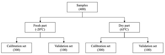 For this study, 400 grass silage samples and 400 corn samples were collected. Each sample was divided into two parts. One part was kept at −20 °C (fresh sample) for the determination of pH and ammoniacal nitrogen, and the other part was dried at 65 °C for further analytical analysis of the remaining chemical and biological parameters (dry sample). NIR spectra were taken for both parts, and independent calibrations were performed for each. During the calibration process, the samples used were further divided into a calibration set (300 samples) and a validation set (100 samples). Figure 2 summarizes how the samples of each forage type were separated and used.