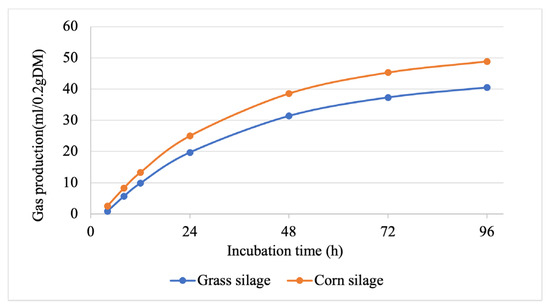 Figure 3 presents the cumulative gas production. It can be observed that corn silages maintain higher gas production than grass silages throughout the whole fermentation period (96 h). The fermentation kinetics are described based on the model of [4], and the results for the in vitro gas production kinetics are summarized in Table 3. It was found that the cumulative gas production values were significantly different (p < 0.05) at all incubation times except 72 h.