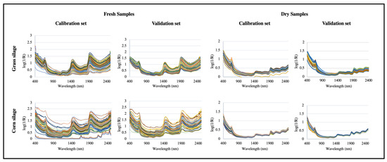 Figure 4. Set of original spectra (without mathematical transformations) in the Vis/NIR region of the different samples for the calibration and validation set of grass silages and corn silages. Each color represents a different sample.