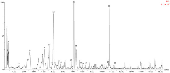 The avocado seeds fermented by the selected strains were analyzed by HPLC-ESI-TOF-MS, and a total of 32 polar compounds were identified. Among them were six phenolic acids, eighteen flavonoids, five terpenoid derivatives, one tyrosol derivative, and other organic compounds. They are presented in Table 1, along with their experimental and calculated m/z, time (min), error (ppm), score (%), molecular formula, m/z main in source fragments, and the tentative name for each compound. The peaks presented in Table 1 correspond to the numbers shown in Figure 1, which is a representative chromatogram of a fermented avocado seed. To the best of our knowledge, 13 polar compounds were identified here for the first time in avocado seeds.