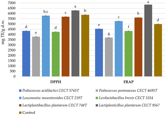 Avocado seeds fermented by different LAB were analyzed with DPPH and FRAP assays to determine the antioxidant activity via the procedures described in previous research [15]. The analyses were performed in triplicate and the results are expressed in mg of Trolox equivalents (TE)/g of dry weight (d.w.).