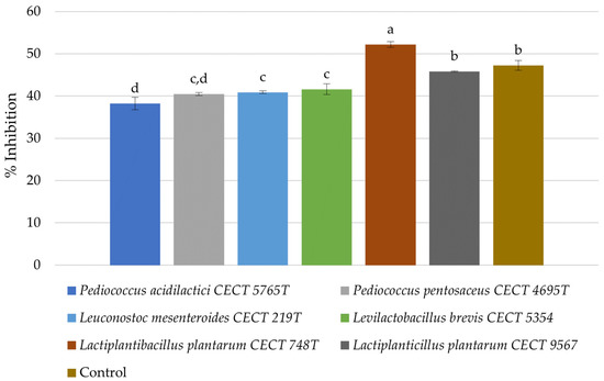 Taking everything into account, in order to compare between the LAB strains, the extracts fermented by Leu. mesenteroides CECT 219 T and La. plantarum CECT 748 T at 48 h and the rest at 24 h were selected. This is also supported by previous research [13].