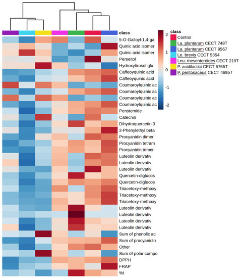 As can be seen from Figure 4, avocado seed fermented by La. plantarum CECT 9567 was clustered with the control samples, showing minor differences. Close to them were the avocado seeds fermented by La. plantarum CECT 748T and Leu. mesenteroides CECT 219T. Although fermentation of the avocado seed with La. plantarum CECT 9567 showed a phenolic profile similar to that of the unfermented seed, key bio-transformations carried out by this strain can be visualized in the figure by color changes. These include increased concentrations of quinic acid and chlorogenic acids, such as some isomers of caffeoylquinic acid, as well as decreased concentrations of hydroxytyrosol-glucoside, by enzymatic hydrolysis for the release of free hydroxytyrosol and glucose. Furthermore, Figure 4 highlights the antioxidant activity by the FRAP assay found in the fermentation with this strain. Another clear group was formed by the rest of the LAB-fermented avocado seeds. In a nutshell, this clustering confirms all the results discussed previously, and shows the differences in the metabolism of the tested LAB on the polar compounds present in avocado seeds.