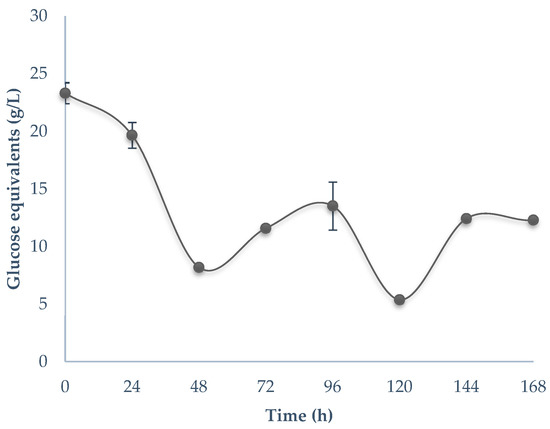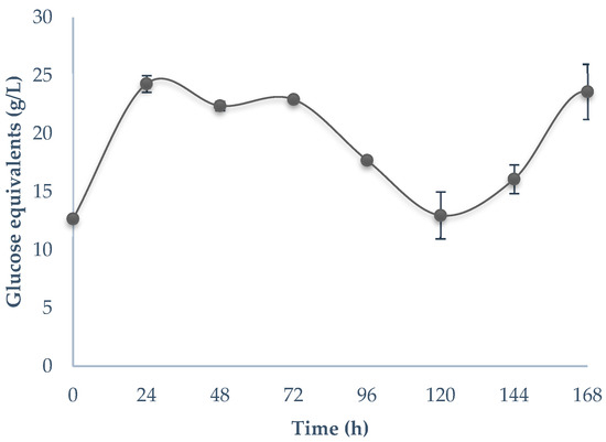 Sugar content acts as a growth inducer along the fungal bioprocessing, and its content is affected through time, as seen in Figure 1. The bioprocess started with a sugar level of 23.03 g/L, with a decrease in content levels to 8.18 g/L at 48 h. Afterward, a tendency to accumulate sugars was observed at 96 h with 13.5 g/L, and the lowest sugar level was detected at 5.3 g/L. Approximately 12 g/L of sugars was maintained until 168 h during the final three monitoring times. In Figure 2, the reducing sugar content is shown. At the beginning of the bioprocess, the content of monomeric sugars was 12.6 g/L, and as time progressed, sugar accumulation was observed until 120 h. Between 24 and 72 h, an approximate amount of 23 g/L was maintained. Afterward, an irregular behavior in sugar content was registered at 120 h until 168 h.