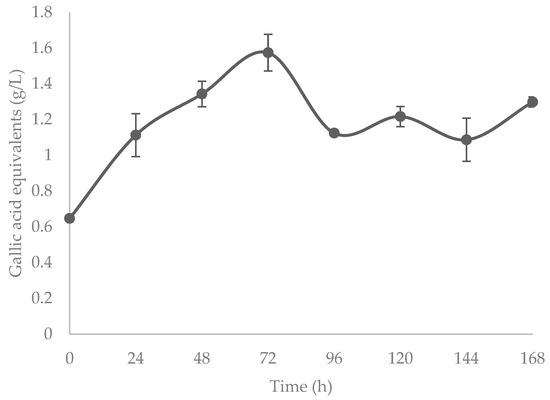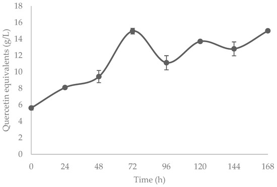 In Figure 3, the THP content is shown. At the beginning of the bioprocess, the THP quantity detected was 0.64 g/L; as time advanced, 1.57 g/L of THP was accumulated at 72 h, and 1.29 g/L of THP at 168 h was detected. For flavonoid content, the presence of the compound evolved from 5.62 g/L to an accumulation of 14.9 g/L at 72 h to a final concentration of also 14.9 at 168 h, as seen in Figure 4. In both cases, polyphenols show an accumulation pattern which indicates an active polyphenol accumulation.