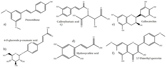 High-performance liquid chromatography detected several bioactive compounds, as seen in Table 2. Compounds such as pterostilbene, hydroxycaffeic acid, caffeoyltartaric acid, and 4-O-glucoside coumaric acid were detected. The separation was made with a gradient method and a C-18 column (specified in the methodology section) with an affinity for polyphenols and their derivates.