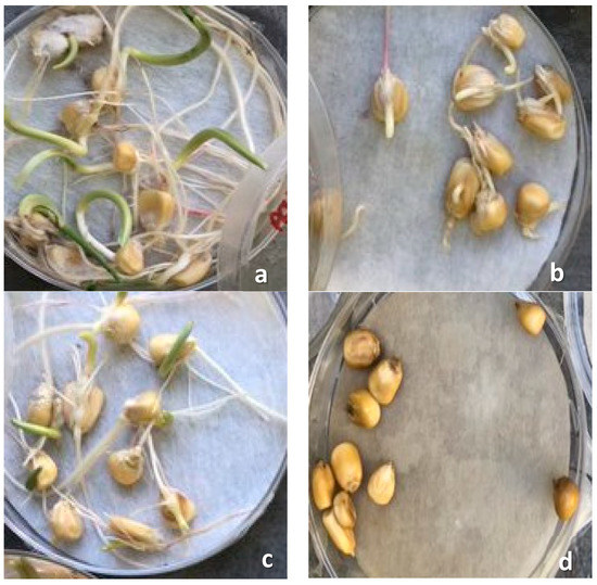 Germination inhibition and root formation in treated seeds of Zea mays where (a) is water control treatment, (b) is glyphosate, (c) is 0.5% BGJ, and (d) is 100% BGJ.