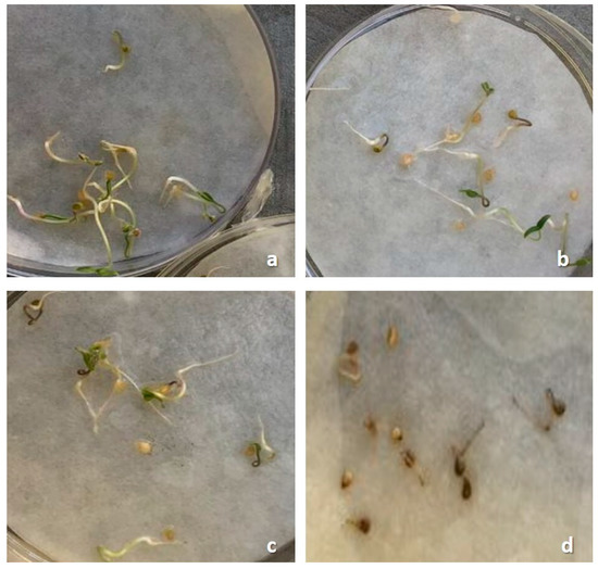 Root formation and germination inhibition in treated seeds of Solanum lycopersicum seeds. (a) is water control treatment, (b) is glyphosate, (c) is 0.5% BGJ, and (d) is 100% BGJ.