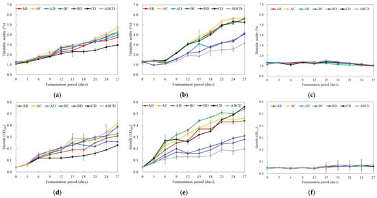 Changes in titratable acidity (a–c) and growth (d–f) under multiple starters according to fermentation temperature and period. Fermentation temperature: (a,d) 20 °C; (b,e) 30 °C; (c,f) 40 °C. Symbols: A, Acetobacter ascendens GV–8; B, A. ascendens GV–12; C, A. pasteurianus GV–17; D, A. pasteurianus GV–22.