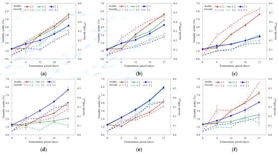 Changes in titratable acidity (solid line) and growth (dotted line) under multiple starters according to the AAB inoculation ratio and fermentation period. Inoculation ratios: 1:1, 1:2, and 2:1. Multiple starters: (a) AB; (b) AC; (c) AD; (d) BC; (e) BD; (f) CD. Symbols: A, Acetobacter ascendens GV–8; B, A. ascendens GV–12; C, A. pasteurianus GV–17; D, A. pasteurianus GV–22.