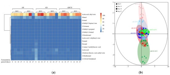 A heatmap was used to visualize the profile of volatile compounds produced by the multiple starters according to the fermentation temperature (Figure 5a). Red color in the heatmap indicates a large amount detected in GC-MS quantitative analysis, and blue color indicates a small amount. A large amount of acetic acid was detected in AB at 30 °C on day 18 compared to day 27 of fermentation, consistent with its acid-producing ability. Acetic acid is produced during the bioconversion of ethanol through two reactions catalyzed by membrane-bound pyrroloquinoline quinone-dependent alcohol dehydrogenase (ADH) and aldehyde dehydrogenase (ALDH) []. ADH oxidizes ethanol to acetaldehyde, which is then converted to acetic acid by ALDH and released into the surrounding environment. These two dehydrogenase complexes are strictly connected to the respiratory chain, which transfers electrons to oxygen through ubiquinone and acts as the final electron acceptor. Acetic acid produced via partial ethanol oxidation can be further oxidized in the cytosol by a series of soluble NaD(P)+-dependent dehydrogenases (ADH and ALDH) via the tricarboxylic acid cycle, resulting in acetate oxidation (peroxidation). Acetobacter spp. are known for their acetate peroxidation activity that can oxidize acetic acid, in addition to their ability to accumulate acetic acid []. It seems that volatile acetic acid was lost as the fermentation period elapsed in the AB–30 °C treatment group. For AD, higher acetic acid levels were detected on day 18, which decreased on day 27 at 20 °C. For AB and AD starters, the titratable acidity was slightly higher when fermented at 30 °C, while the measured volatile compounds were higher when fermented at 20 °C. For the ABCD multiple starter, similar amounts of acetic acid were detected at 20 °C and 30 °C; however, a lower volatile compounds content was detected, compared to that in the AB and AD starters. Therefore, AB fermented at 30 °C for 18 days and AD fermented at 20 °C for 18 days were judged to have a high flavor component-producing ability.