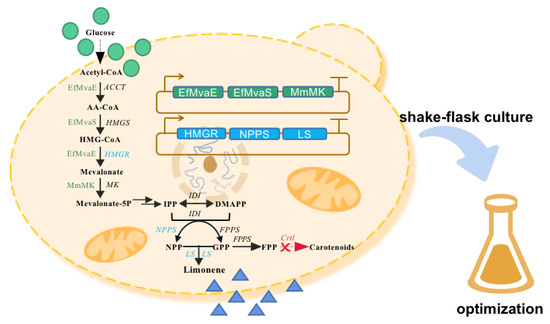 - Cheng, S.; Liu, X.; Jiang, G.; Wu, J.; Zhang, J.; Lei, D.; Yuan, Y. Orthogonal engineering of biosynthetic pathway for efficient production of limonene in Saccharomyces cerevisiae. ACS Synth. Biol. 2019, 8, 968–975. [Google Scholar] [CrossRef]