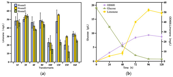 - Wu, J.; Cheng, S.; Cao, J.; Qao, J.; Zhao, G.R. Systematic optimization of limonene production in engineered Escherichia coli. J. Agric. Food Chem. 2019, 67, 7087–7097. [Google Scholar] [CrossRef] [PubMed]