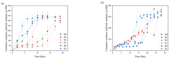 Cumulated methane yield. (a) Cumulative methane yield in the last batch; (b) Cumulative methane yield in the first batch.