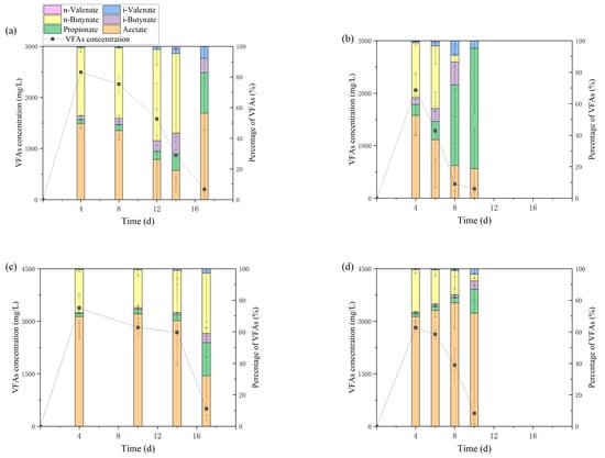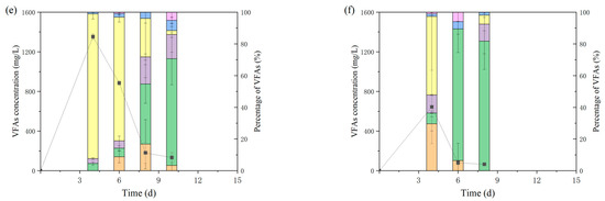 VFAs accumulated rapidly in the first 4 days, and the accumulated VFAs were dominated by acetate and n-butyrate. The F0 group with the longest lag period had the highest VFA and acetate concentrations of 3379 mg/L and 2353 mg/L, respectively, while the maximum n-butyrate concentration was found in S0 at 1234 mg/L. The maximum VFA concentration in the reactor containing hydrochar was lower than that in the control group, with the G, F, and S groups being 17.5%, 16.7%, and 52.4% lower than the corresponding control groups, respectively, which corroborated the results obtained from model fitting; G1 and F1 produced more methane in the first stage than G0 and F0, and the maximum methane production rate r1 in the first stage of G1 was 89.5% higher than that of G0, indicating that the methanogens in the reactor with hydrochar had higher activity and produced more methane before VFAs accumulated. The situation was different in group S with sludge digestate as inoculum. Firstly, there was only one stage and no lag period in group S1 because of the higher microbial activity and different microbial composition of sludge digestate. Although there were two stages in the control group S0, the methane yield in the first stage was more than half of the total yield and the VFA concentration was 1352 mg/L, much lower than that in groups G and F. Secondly, the VFAs accumulated in the reactor of group S were dominated by butyrate solely. It is worth noting that no acetate was detected on day 4 in S0, while the concentration of butyrate decreased on day 6 as the concentration of acetate increased slightly, indicating that the rate of acetate production was lower than the rate of consumption during the first 4 days in S0. Methanogenesis slowed down due to the insufficient acetate supply until day 6 when the rate of butyrate decomposition increased. Therefore, the diauxie in S0 was not caused by the inhibition of VFAs, but by the blockage of the conversion of butyrate to acetate. In contrast, a small amount of acetate accumulated in S1 on day 4, and the concentration of butyrate was substantially lower than that in S0, suggesting that the addition of hydrochar increased the rate of butyrate degradation or reduced the production of butyrate. A similar phenomenon was found in the study by Wang et al. [3]. The acetate/butyrate ratio increased as the dope of biochar increased, and the conversion of butyrate to acetate occurred before, rather than simultaneously with, methane production. Wang speculated that this was due to the biochar assisting in the electron transfer of the process.