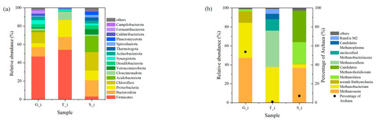 Taxonomic classification of microorganisms in the inocula. (a) Bacteria on phylum level; (b) archaea on genus level.