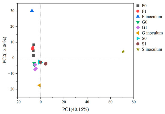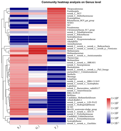 The difference in inoculum had limited effect on the final microbial composition. Firstly, the inoculum determined the presence or absence of certain key microorganisms. For example, Anaerolineae and Methanosaeta were abundant in group G and S, indicating that the experimental conditions favored their growth, but they were not present in group F due to their absence in the food waste digestate. Which microorganisms dominated in the inoculum had little effect on the final microbial composition, as any microorganisms that were not adapted to the experimental conditions would rapidly decrease regardless of their abundance in the inoculum, such as no rank Firmicutes and Thiopseudomonas (not shown in Figure 6). In contrast, some microorganisms with very low abundance in the inoculum may eventually dominate, such as Clostridium, Syntrophomonadaceae, and Methanosarcina. Although the dominant microorganisms were the same in all three groups, bacteria with higher relative abundance but without absolute dominance varied depending on the inoculum.
