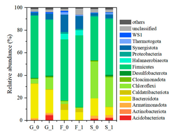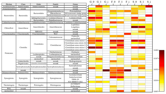 After cultivation with glucose as a substrate for four batches, Firmicutes dominated in all reactors (Figure 5). The inocula of groups G and F had a high proportion of Firmicutes, which was maintained after cultivation. The proportion of Firmicutes in the inoculum of group S was only 3.2%, which was increased to 38.5% and 49.2% after cultivation, indicating that, in this experiment, Firmicutes was the main phylum of bacteria that catabolized glucose and VFAs. Bacteroidota and Chloroflexi, which had high proportions in the inocula, did not change much in the proportions before and after cultivation. In addition, Synergistoga, which was present in small amounts in the inoculum, was enriched after cultivation, especially in the F group where the proportions reached 15.4% in F0 and 11.4% in F1.