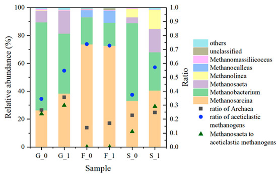 At the end of the experiment, the proportion of archaea ranged from 13.9% to 36.7% (Figure 7). The proportion of archaea in granular sludge was 53.7%, which decreased after cultivation, while the proportions in group F and S increased after cultivation. The proportion of archaea increased with the addition of hydrochar by 9.2, 3.1, and 2.0 percentage points in groups G, F, and S.