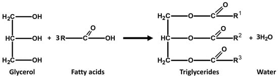 The oil consists of triglycerides or long-chain aliphatic acid esters with high molecular weights, both saturated and unsaturated. The formation of triglycerides is generally the result of the reaction between glycerol and fatty acids to produce triglycerides and water, as can be seen in Figure 2.