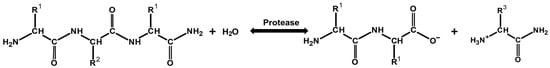 Coconut oil is in the form of granules in the form of an emulsion with water, and each grain is covered by protein. Basically, the process of taking the oil is to break down the protein layer so that the oil can diffuse out. The papain enzyme is able to break down protein layers because it has proteolytic properties that target peptide bonds, namely bonds between amino acids. Hydrolyzed protein peptide chains so that the bond between CO and NH is broken, which causes the protein to break so that the oil emulsified in water can flow out [,]. The reaction of peptide decomposition by enzymes is shown in Figure 3.