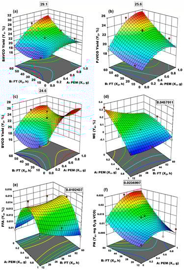 (a) 3D RSM plots of PEM and FT on BAVCO yield; (b) PJVCO yield; (c) BVCO yield; (d) WC; (e) FFA; (f) PN.
