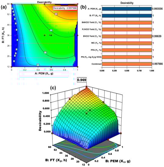 (a) Contour RSM plots of PEM and FT on desirability; (b) Pareto plots on each variable response desirability and the desirability combined; (c) 3D RSM plots on desirability.