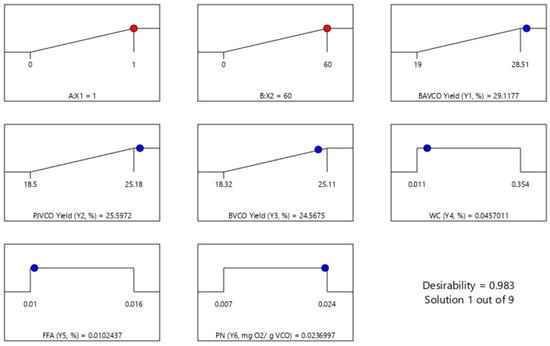 Table 4 shows the selected constraints based on criteria that match the objectives to be achieved. The desirability of all variables and specific response variables is close to 1. Its value describes the correlation of all independent and response variables under optimum conditions. This design is needed to predict optimal conditions for numerical optimization. Figure 6 shows the desirability of optimizing the influence of PEM, and FT on response variables, namely: BAVCO yield (Y1, %), PJVCO yield (Y2, %), BVCO yield (Y3, %), WC (Y4, %), FFA (Y5, %) and PN (Y6, mg O2/g VCO). The independent variables involved in this study are actually, in addition to the independent numerical variables, namely FFA and FT, there are categorical variables, namely Banda Aceh coconuts, Pidie Jaya coconuts, and Bireuen coconuts, but using CCD instead of a mixture. Design is not shown as a variable in the experimental design because it can be read directly as a numerical or categorical variable. In contrast, the response variables are quantitative and qualitative all appear, namely (Y1, Y2, Y3, Y4, Y5, and Y6. X2 = 60 h), BAVCO (Y1 = 29.118%), PJVCO (Y2 = 25.6%), BVCO (Y3 = 24.6%), WC (Y4 = 0.046%), FFA (Y5 = 0.01%), PN (Y6 = 0.024 mg O2/g VCO) and desirability 0.983. From the optimal conditions obtained from the influence of PEM, FT from coconut sources, namely Banda Aceh, Pidie Jaya, and Bireuen coconuts, the yield of BAVCO > yield of PJVCO > yield of BVCO. In terms of quality, in terms of WC, FFA, odor, and desired aroma is 0.983, meaning that this research has better prospects to make VCO from coconut raw materials in Aceh Province.