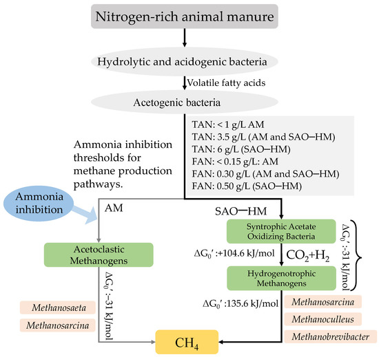 In the anaerobic digestion of animal manure, ammonia nitrogen can also influence the acetogenesis step. For instance, by reducing the TAN concentration from 5.6 to 3.8 g/L in a hyper-thermophilic (70 °C) digester treating chicken manure, the acetogenesis efficiency increased by 52%. In addition, an increase in ammonia concentration (TAN, 0.8 to 6.9 g/L) has been shown to cause distinct shifts in the acetogenic population structure in a mesophilic digester [102]. Since various microorganisms cooperate in the anaerobic system, ammonia directly or indirectly affects their activities. Hence, structural changes in the acetogenic population can also be driven by the fluctuation of organic acids and pH caused by high ammonia concentration. As the acetogenic step is not considered the bottleneck step, few studies have looked into the effect of ammonia inhibition on acetogenic bacteria.